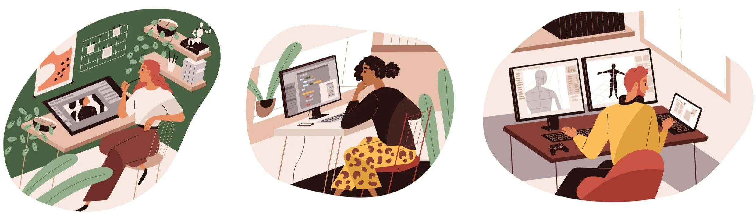 Illustration of a woman working on a laptop at a desk, surrounded by indoor plants and shelves with books and decorative items, with chat bubbles indicating online messaging. Singapore