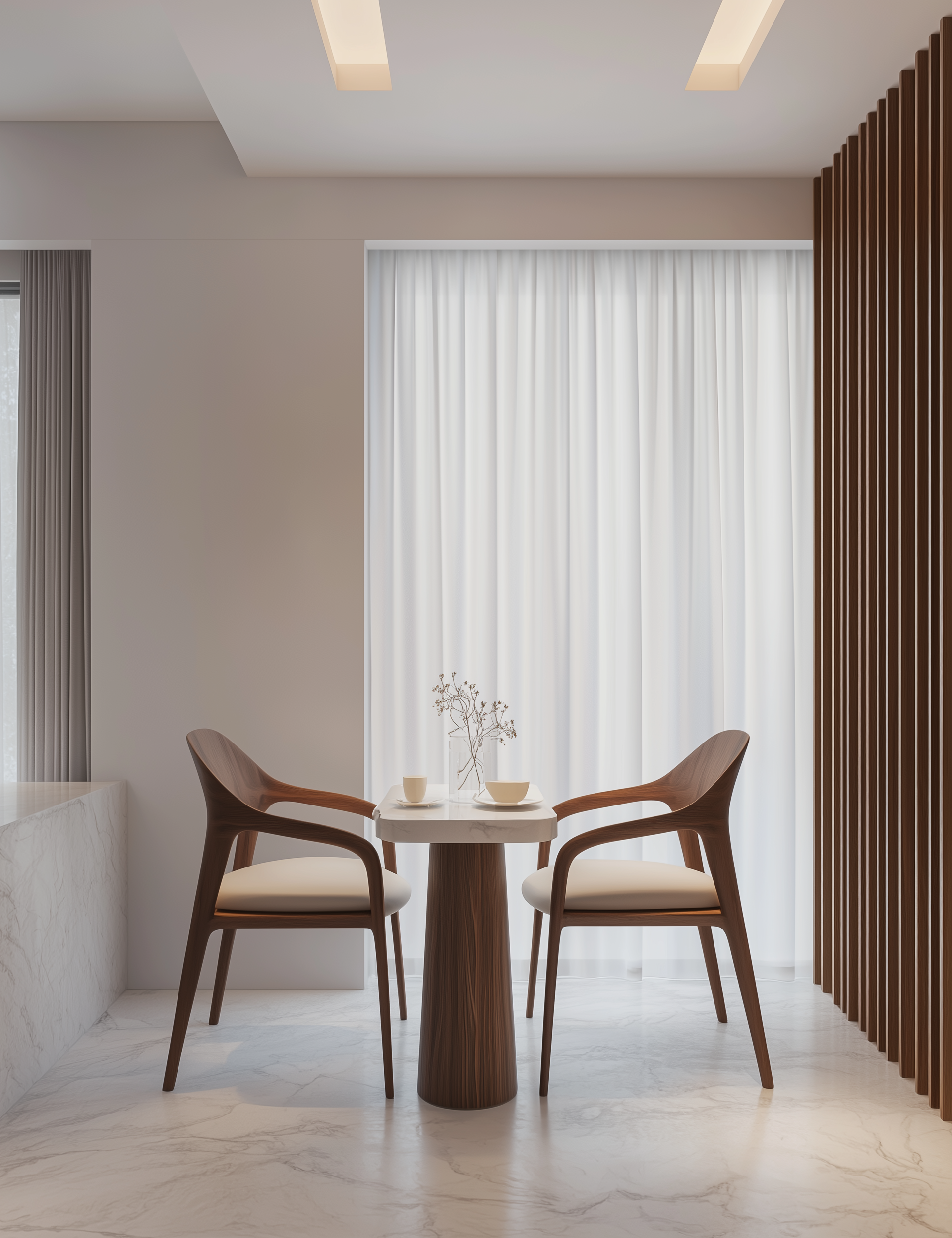 From the sculptural marble island in the kitchen to the serene wood-accented bedroom, the design celebrates simplicity through detail. The use of two different stone-inspired floorings helps distinguish zones while maintaining harmony, allowing every area to feel connected yet individually defined. The result is a home that embodies refined minimalism and understated luxury.